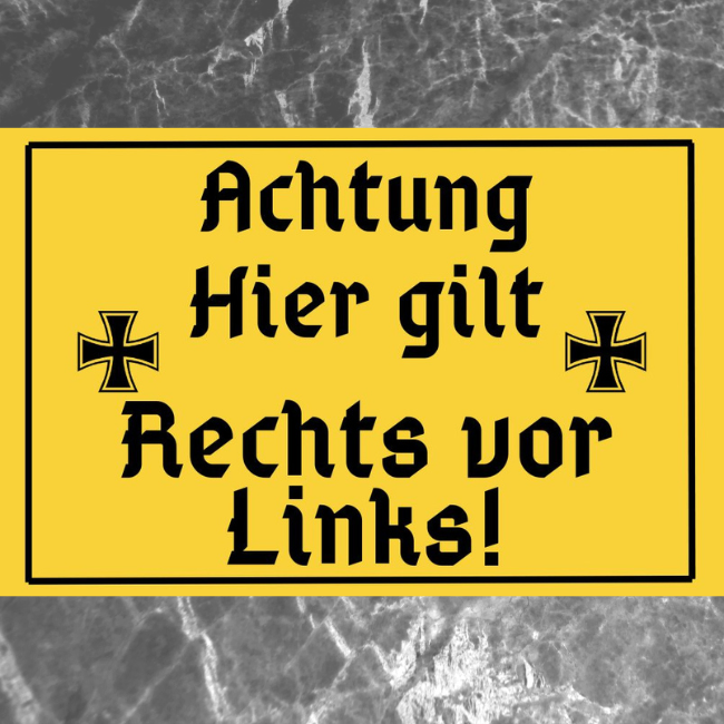 - Design: Auffällige „Achtung Hier gilt Rechts vor Links“ Botschaft.